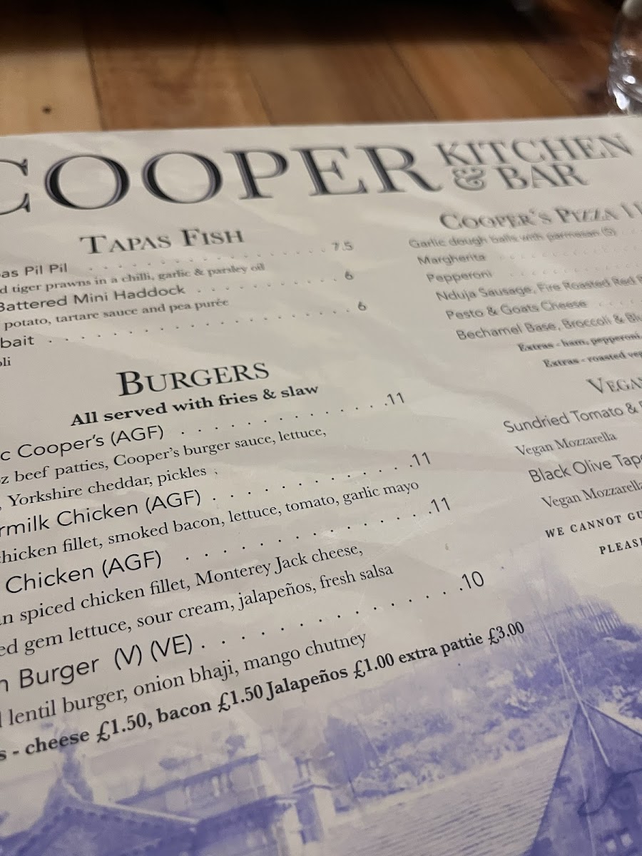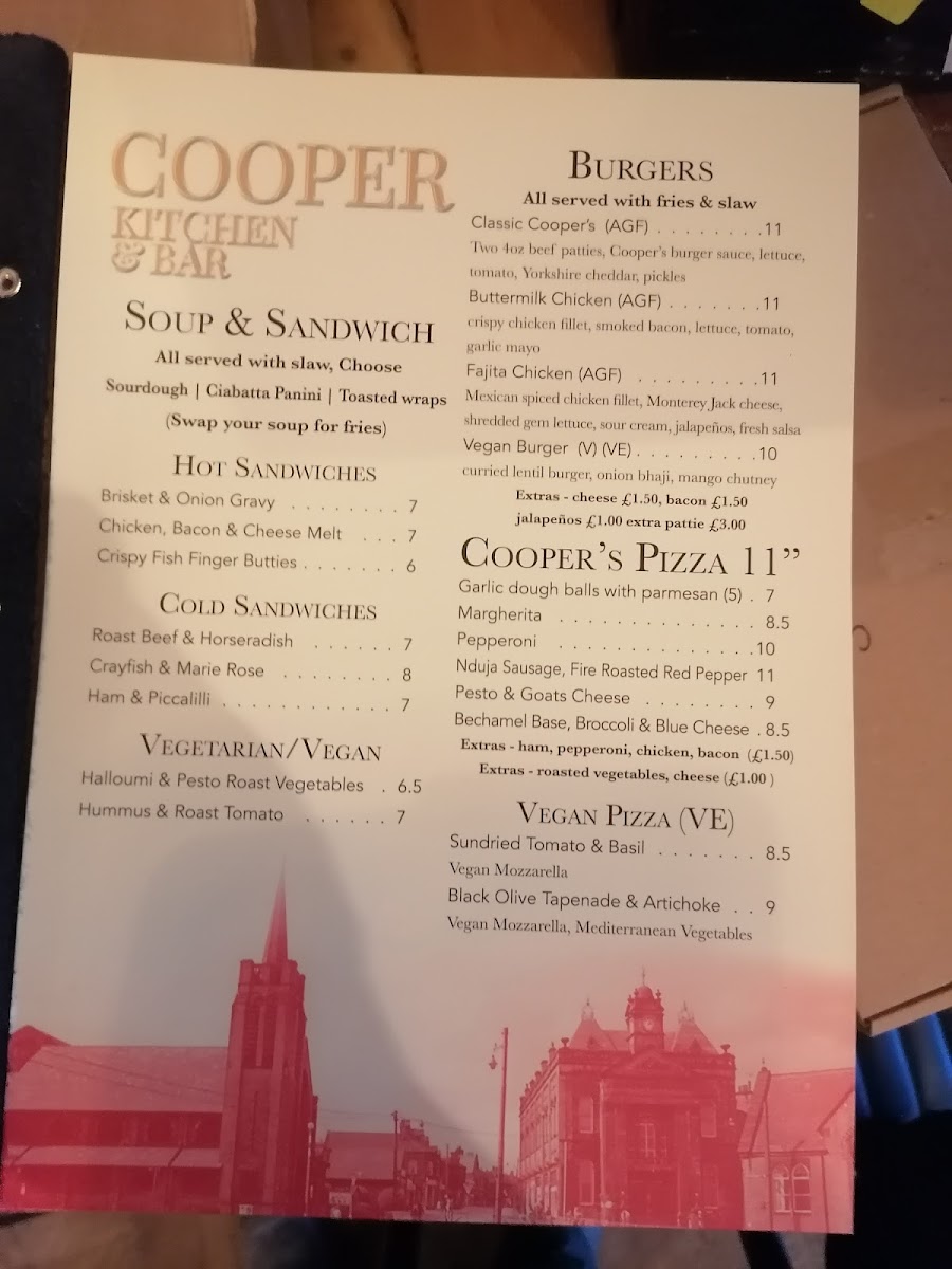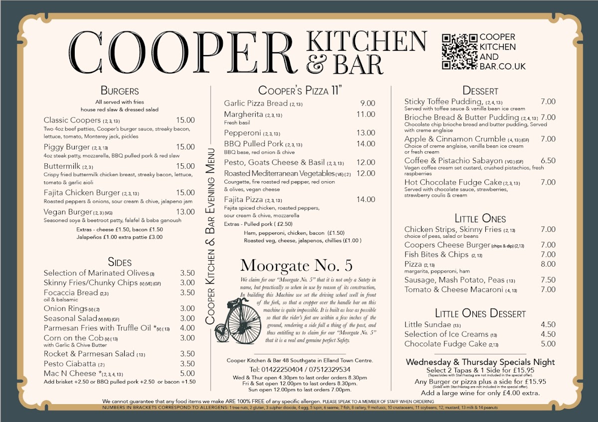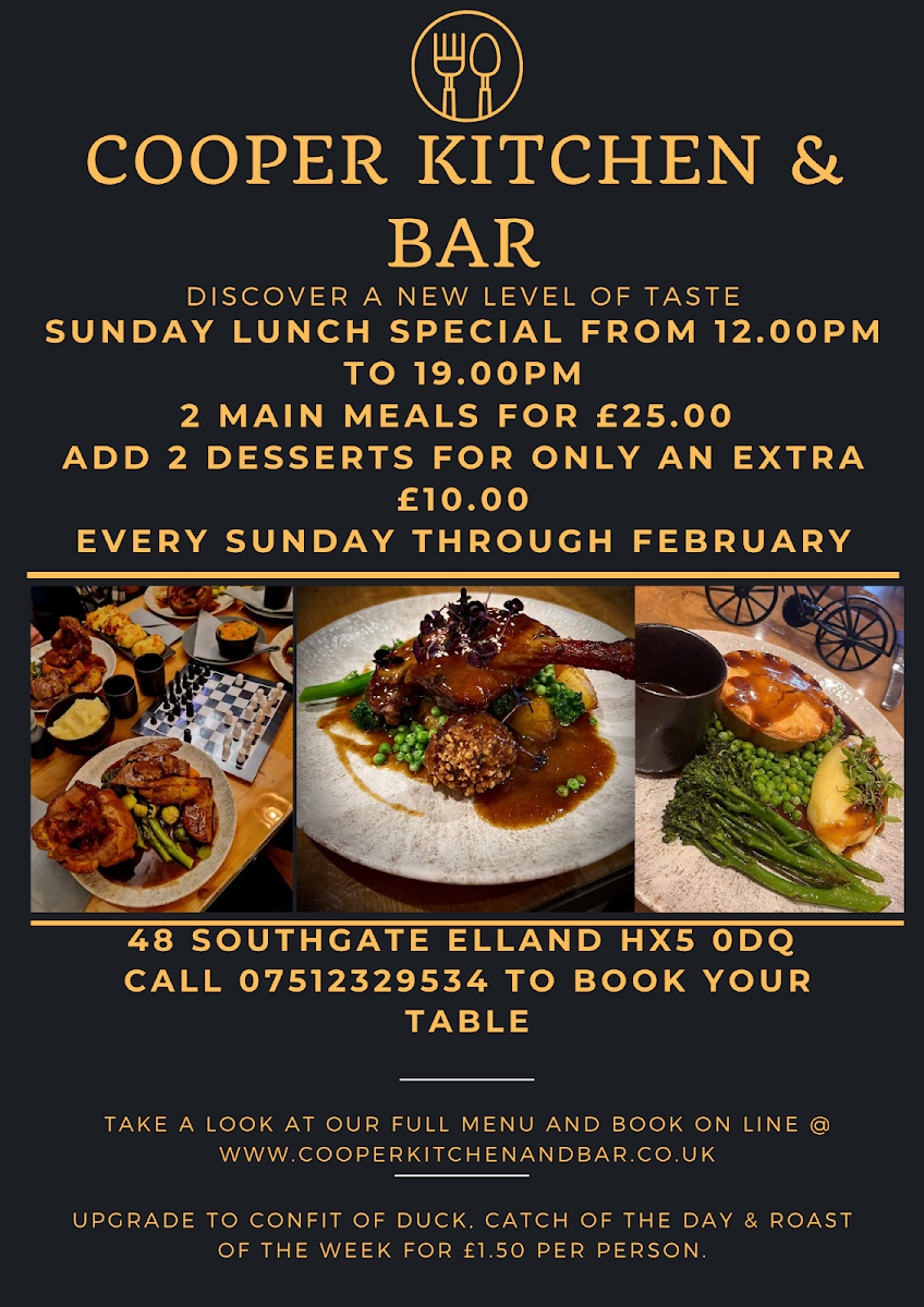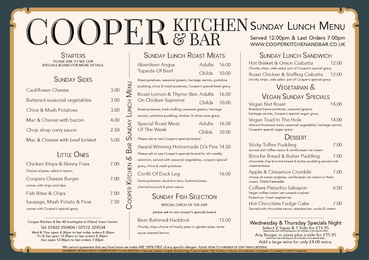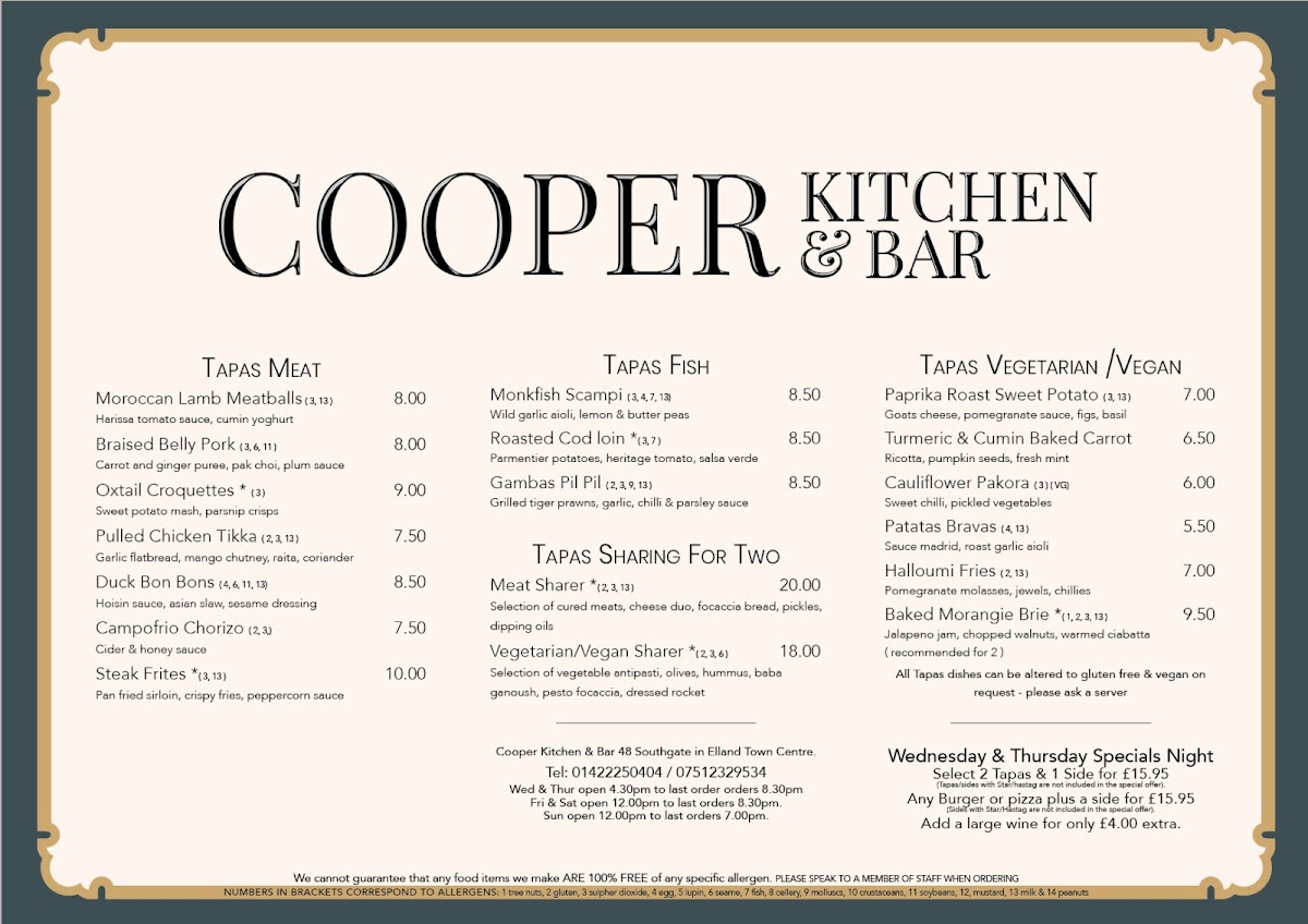 Welcome to Cooper Kitchen & Bar Ltd, located in the heart of Elland at 48 Southgate. This charming venue has quickly become a local favorite, celebrated for its inviting atmosphere and diverse menu. Since April 2023, the Lunch Menu, Evening Tapas Menu, and Sunday Lunch Menu have showcased an array of flavors, catering to gluten-free and dairy-free diets, ensuring everyone can indulge.